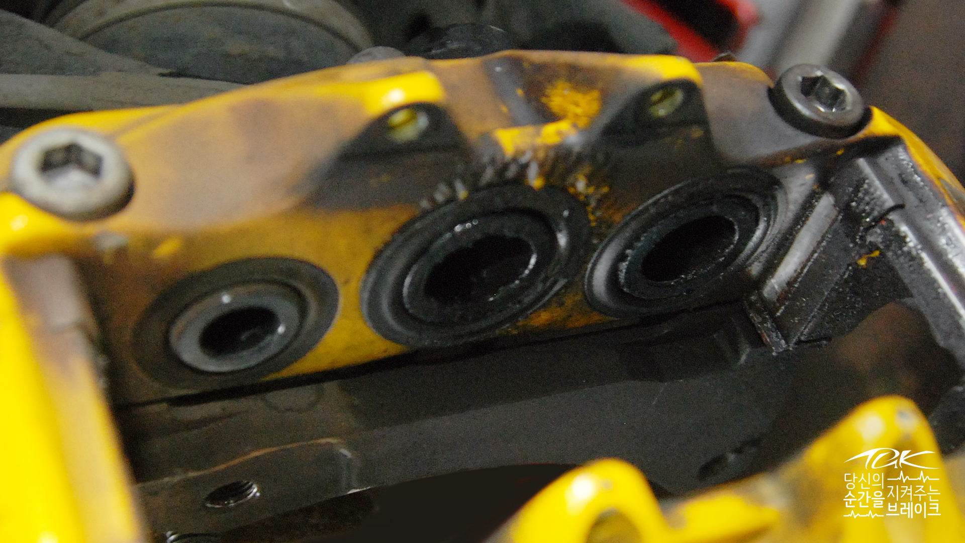 브레이크 캘리퍼 피스톤쪽에서 브레이크액이 누유되고 있었습니다.